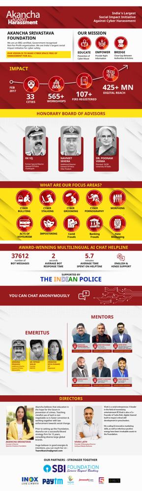 Through her foundation, Akancha Srivastava has been instrumental in raising awareness about cyber safety and online harassment. Her work focuses on educating different demographics about digital safety and providing support against cyber threats.36