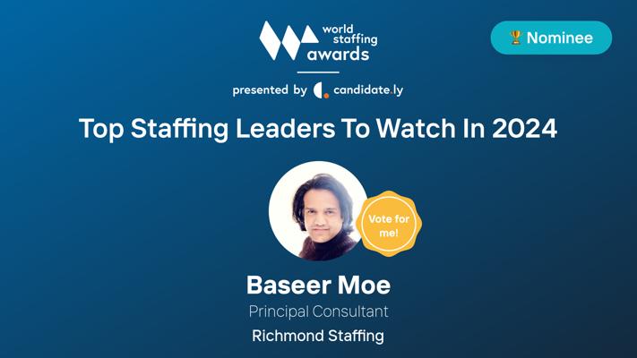 Recognized as a top Canadian recruiter, Baseer Moe was named Top Canadian Recruiter 2020.2 He specializes in cost-effective, rapid hiring solutions4 and has been nominated for the World Staffing Award 2024 under the category "Top 100 staffing leaders to watch".5