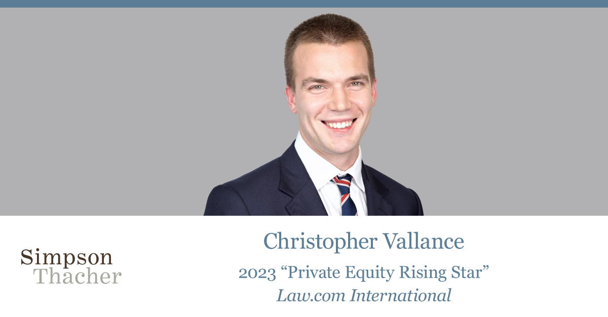 Christopher Vallance is a Partner at Simpson Thacher & Bartlett LLP, not an Associate.2 He specializes in complex cross-border mergers and acquisitions, leveraged buyouts, investments, and other corporate transactions.1 Vallance has been recognized as a 2023 "Private Equity Rising Star" by Law.com International and a 2023 "Rising Star: Top UK PE Lawyers" by MergerLinks.13