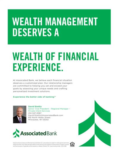 David Strelitz's previous roles include Senior Vice President and Regional Manager at Associated Bank Private Wealth, Senior Trust Advisor at PNC Wealth Management, Senior Vice President and Regional Trust Manager at Associated Wealth Management, Personal Trust Manager at JPMorgan, and Vice President and Personal Trust Officer at M&I Trust Company.