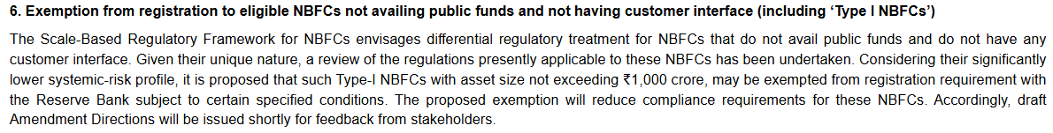 What RBI has done today is to remove that requirement if you're less than 1000 cr. in assets, and don't have any customer interface or take money from the public. Great to create new funds that are primarily pooled family or friend vehicles in India.