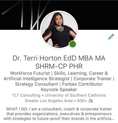 Based in the Los Angeles Metropolitan Area, Dr. Horton serves as a consultant, speaker, and educator specializing in the future of work, talent management, and organizational culture. She has over a decade of experience advising Fortune 500 companies, global firms, and educational institutions on strategic change and the integration of generative AI in workforce practices. Dr. Horton is recognized as a thought leader, having contributed insights to major organizations like the Pew Research Center and Forbes, and she has delivered numerous keynotes and workshops globally.1