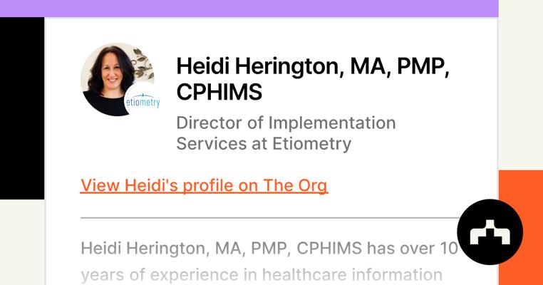 Heidi Herington is the Vice President of Project Management & Implementation Services at Etiometry Inc., a clinical decision support software company.15 She joined Etiometry in July 2021 and is based in Portland, Oregon.1