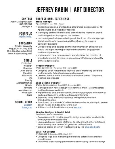 Jeffrey Rabin is a Chicago-based graphic designer and creative professional.2 He has worked as a Design Lead and Lead Graphic Designer at 3Points Communications.1 Rabin holds degrees in Advertising and aspires to become an Art Director in the advertising industry. He specializes in graphic design and digital art.2 Currently, Jeffrey Rabin works as a freelancer and has previous experience at Wilson Dow Group as a Graphic Designer.12 He is also known for his advice on overcoming creative blocks, suggesting taking brain breaks to avoid overdrive when facing creative challenges.3