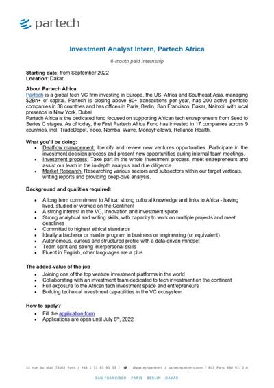 As of February 2, 2024, Marie announced that Partech Africa was hiring an Investment Analyst in Lagos, indicating the firm's continued growth and expansion in the African market.4