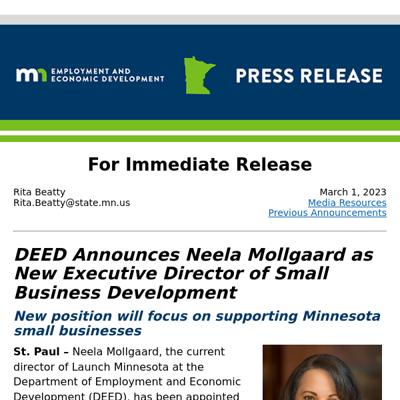 Neela Mollgaard is the Executive Director of the Office of Small Business & Innovation at the Minnesota Department of Employment and Economic Development (DEED). She was appointed to this position in March 2023, where she focuses on supporting Minnesota's small business sector, including entrepreneurs and startups.356