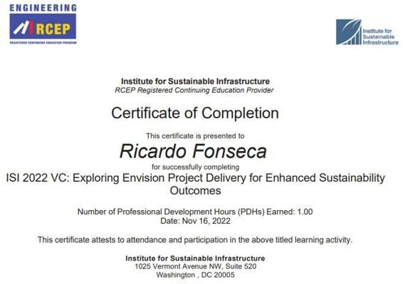 - Certification: Envision Sustainability Professional (ENV SP) from the Institute for Sustainable Infrastructure1